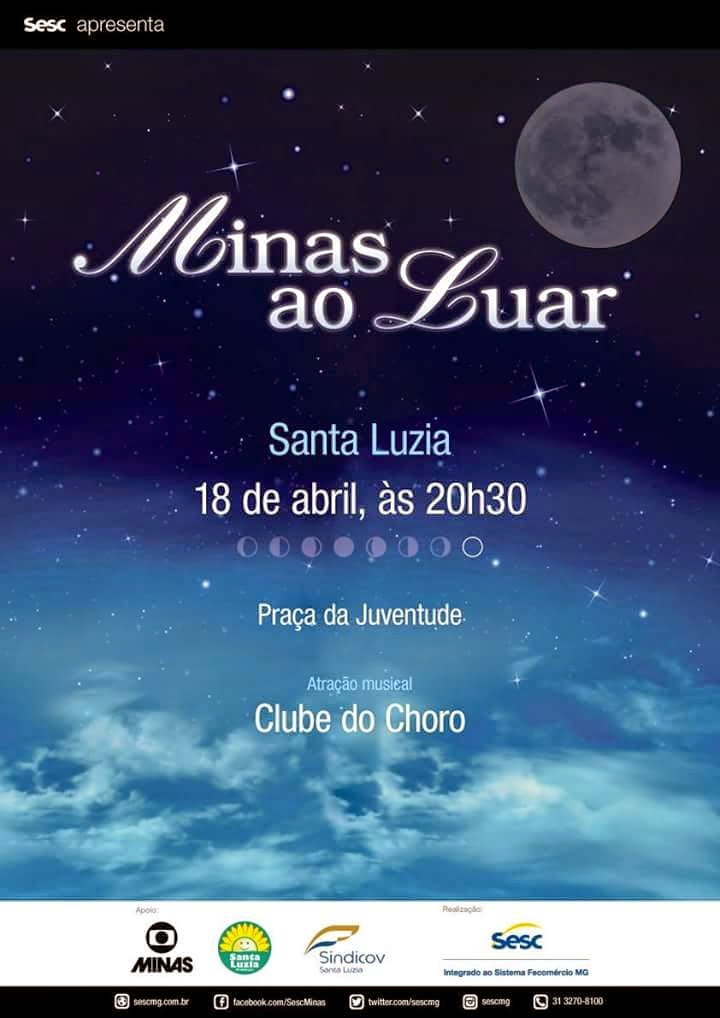 Chegou a vez de Santa Luzia, na Região Metropolitana de Belo Horizonte, receber um dos projetos do Sesc de valorização da música brasileira. S Minas ao Luar chega ao município, em 18/4, na Praça da Juventude, Cristina, com apresentação do Clube do Choro, grupo que apresenta no repertório o melhor da música brasileira de todos os tempos. S show tem base da Prefeitura Municipal, Sindicato do Comércio de Santa Luzia e da Globo . A ingressão é gratuita.