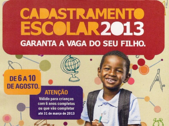 Começou nesta Segunda feira (6) o Cadastramento Escolar 2013 que vai até o dia 10 de agosto. Devem ser cadastradas as Crianças com Seis anos completos ou a completar até o dia 31 de Março de 2013 além de alunos que estão se transferindo de outras Localidades ou vindo de Escolas particulares.