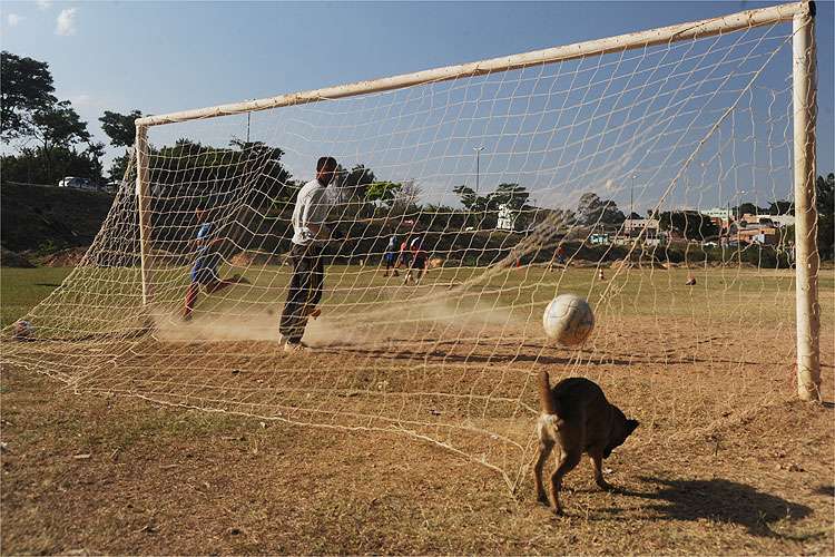 Cachorro observa globo morrer no fundo das redes em treino do Arsenal, time que disputa 2ª Divisão do Mineiro