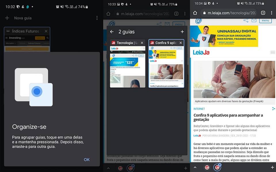 A novidade segue a versão para desktop que recebeu, em 2020, a função de ajuntamento de guias. O recurso também fornece um novo vereda para saltar entre as guias no mesmo grupo, por meio de um menu que aparece na secção subalterno do aplicativo. No Android, você pode organizar as guias em grupos a partir da tela de layout da grade, dos quais ícone é o mesmo que mostrava as abas na versão anterior a atualização.